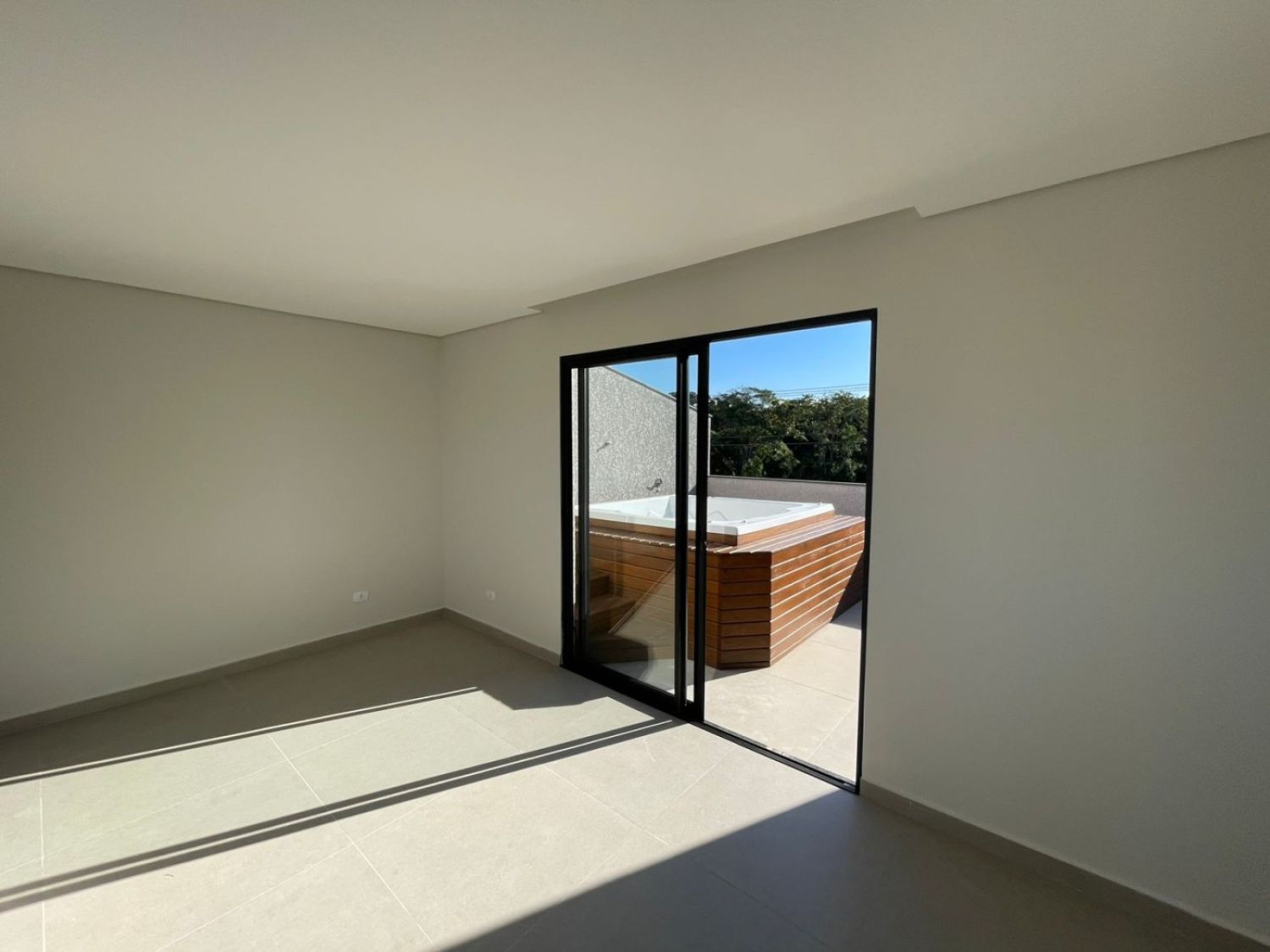 Sala de estar ampla, piso em porcelanato e esquadrias em alumínio preto com vidro temperado.