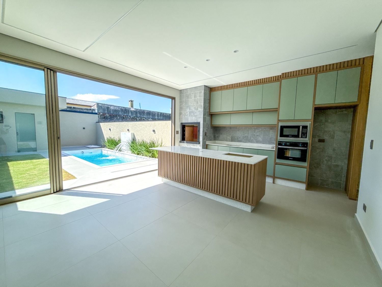 Cozinha : lha com granito em quartzo branco, microondas e forno elétrico embutido.