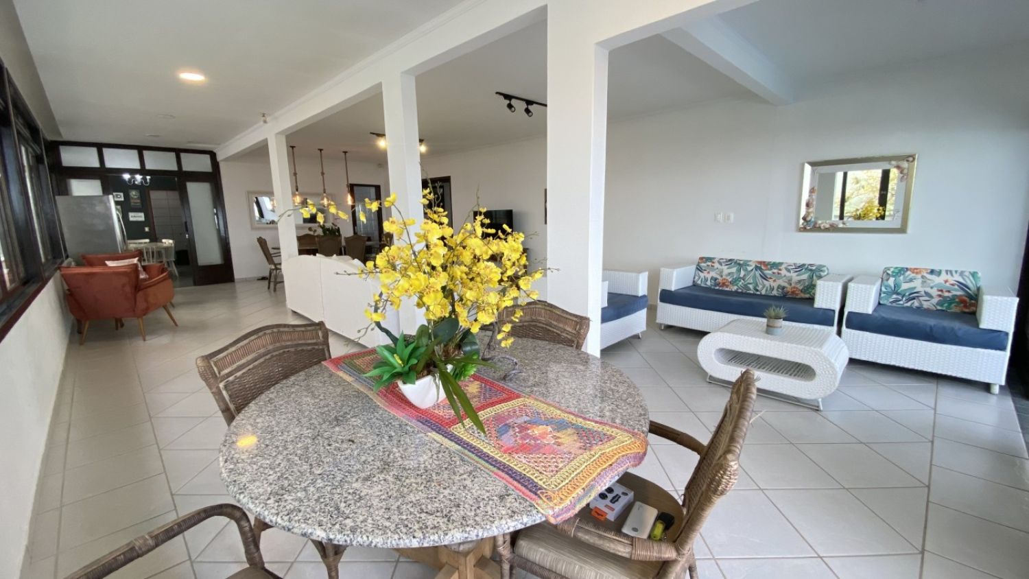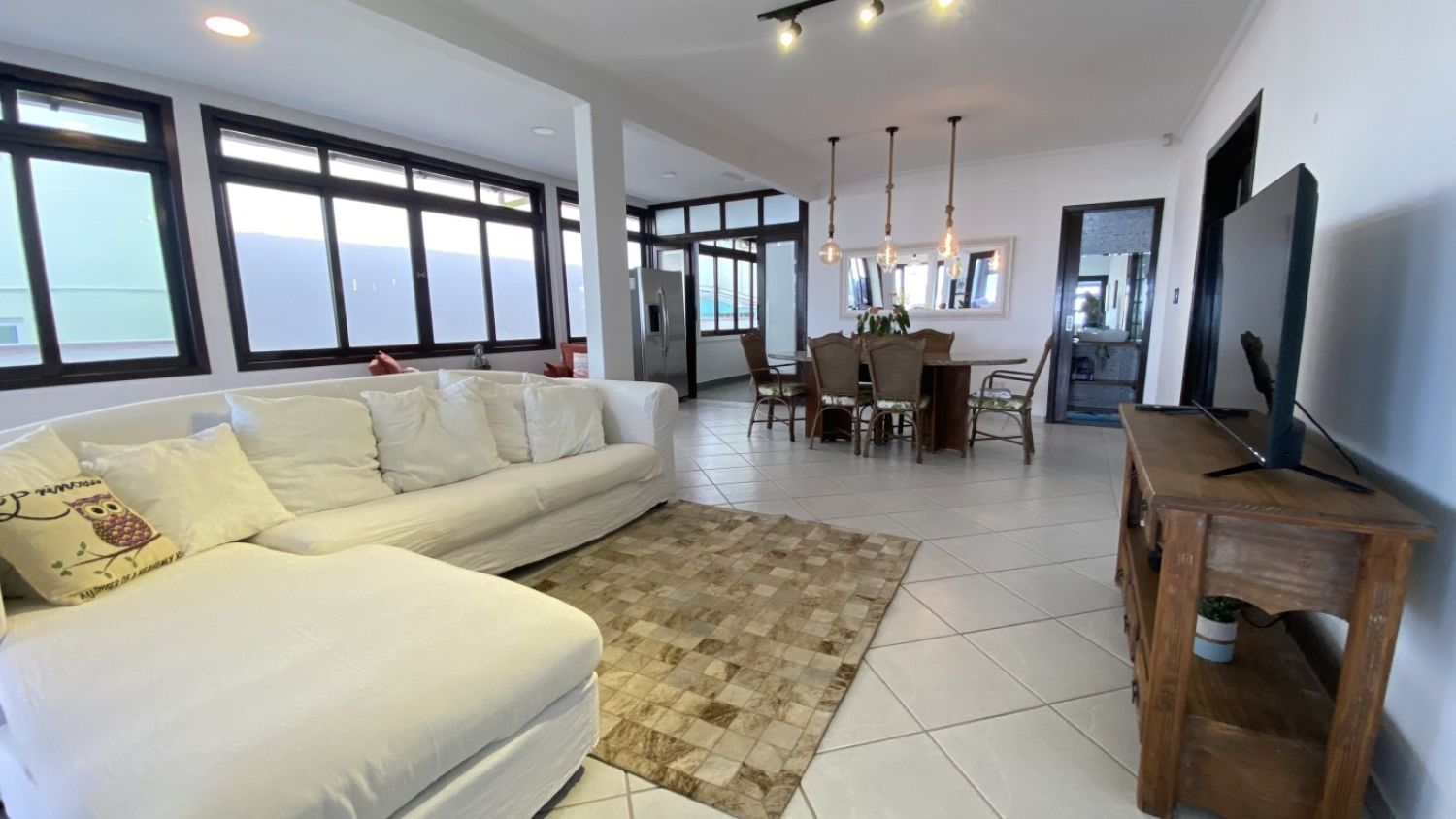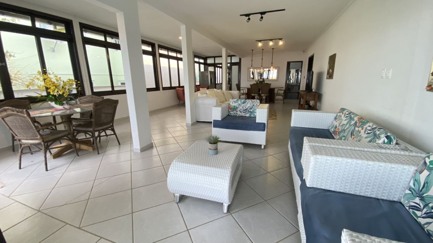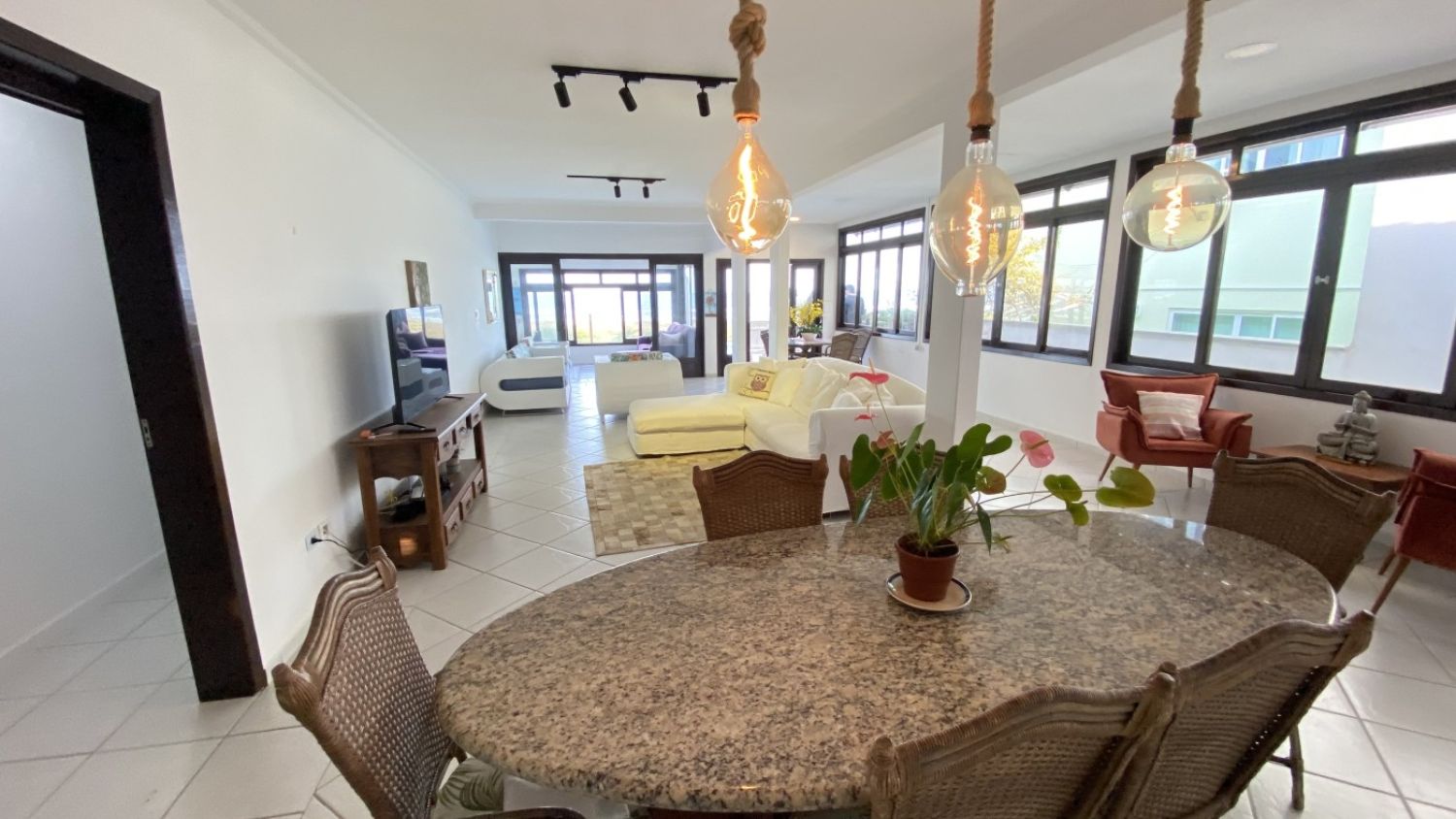 Um livin intergada em que todos os ambientes possuem uma vista impecável do mar.