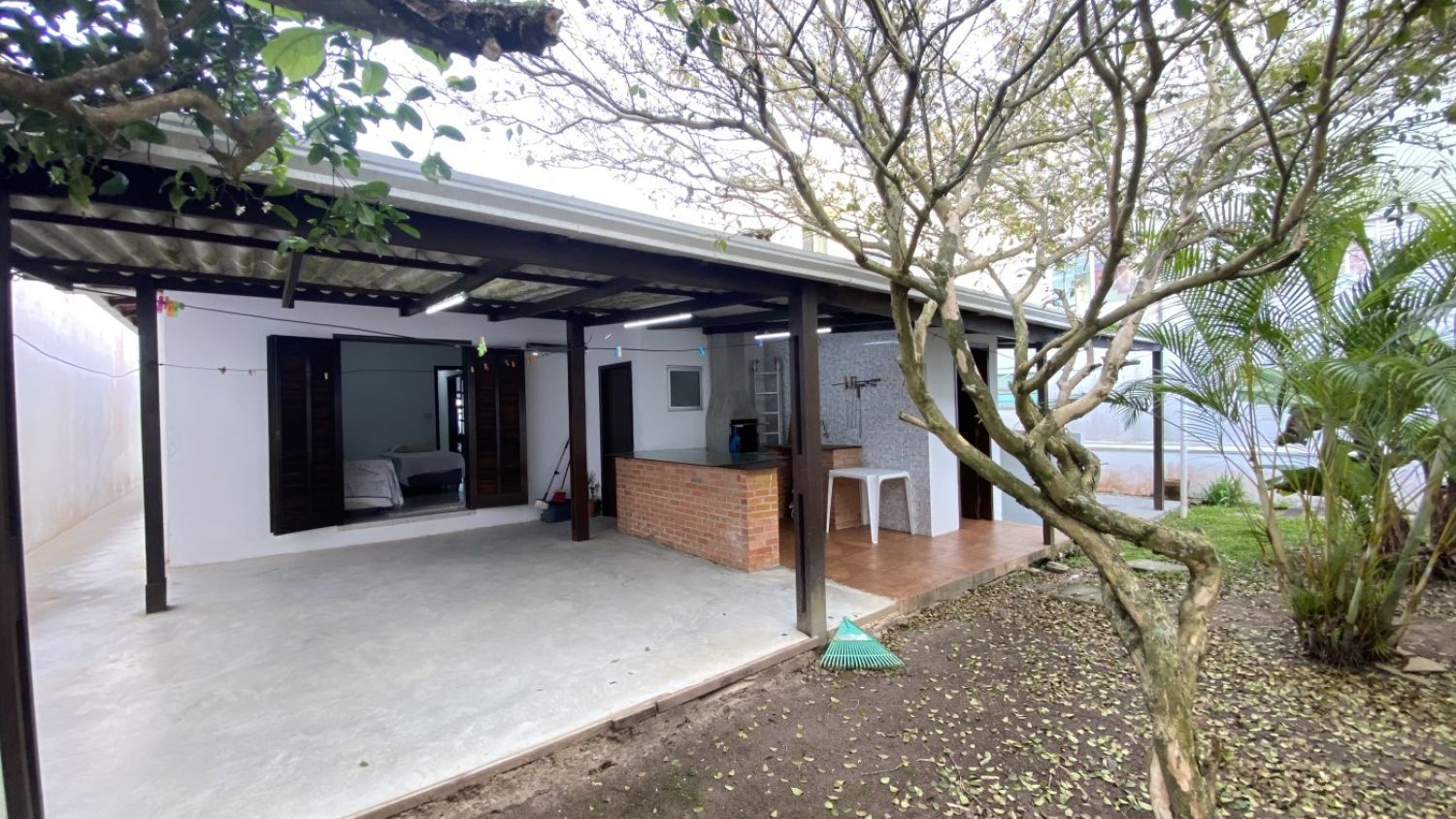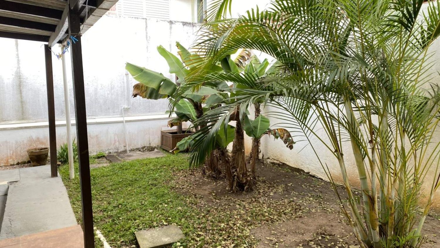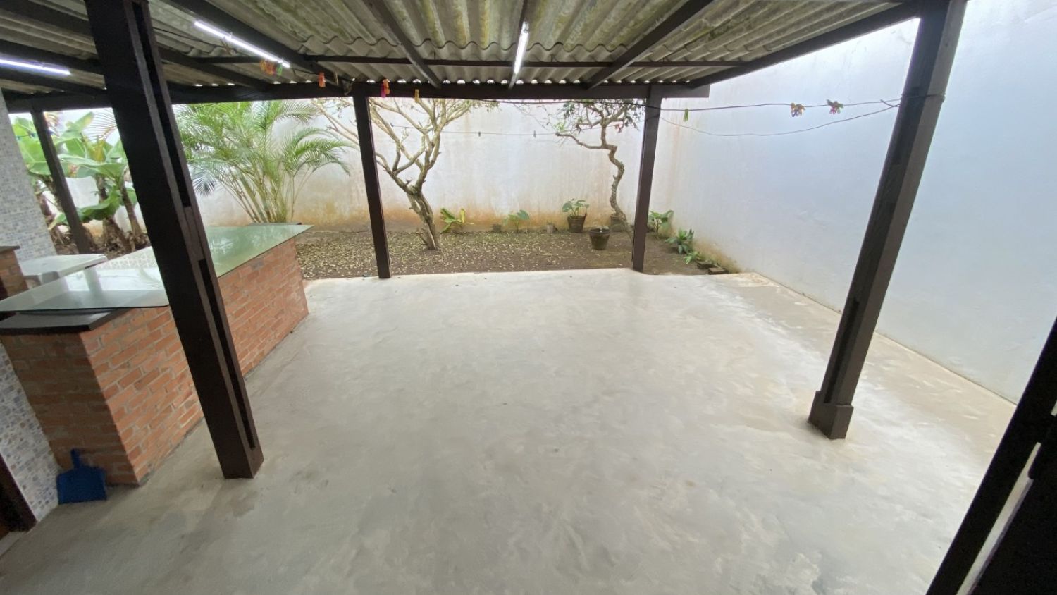 Um pequeno jardim nos fundos da casa com churrasqueira.