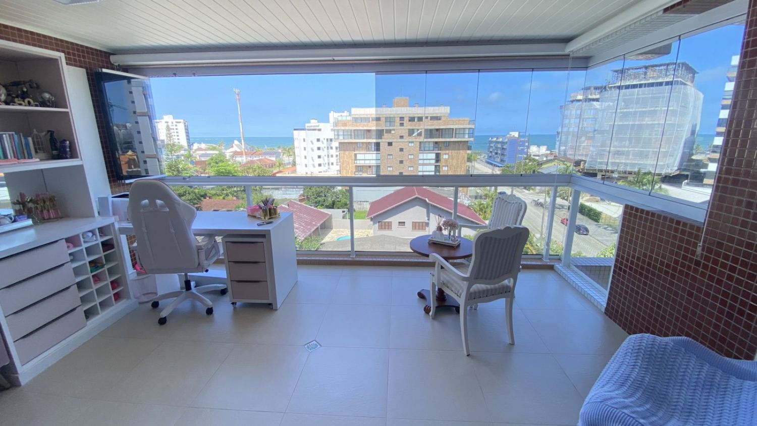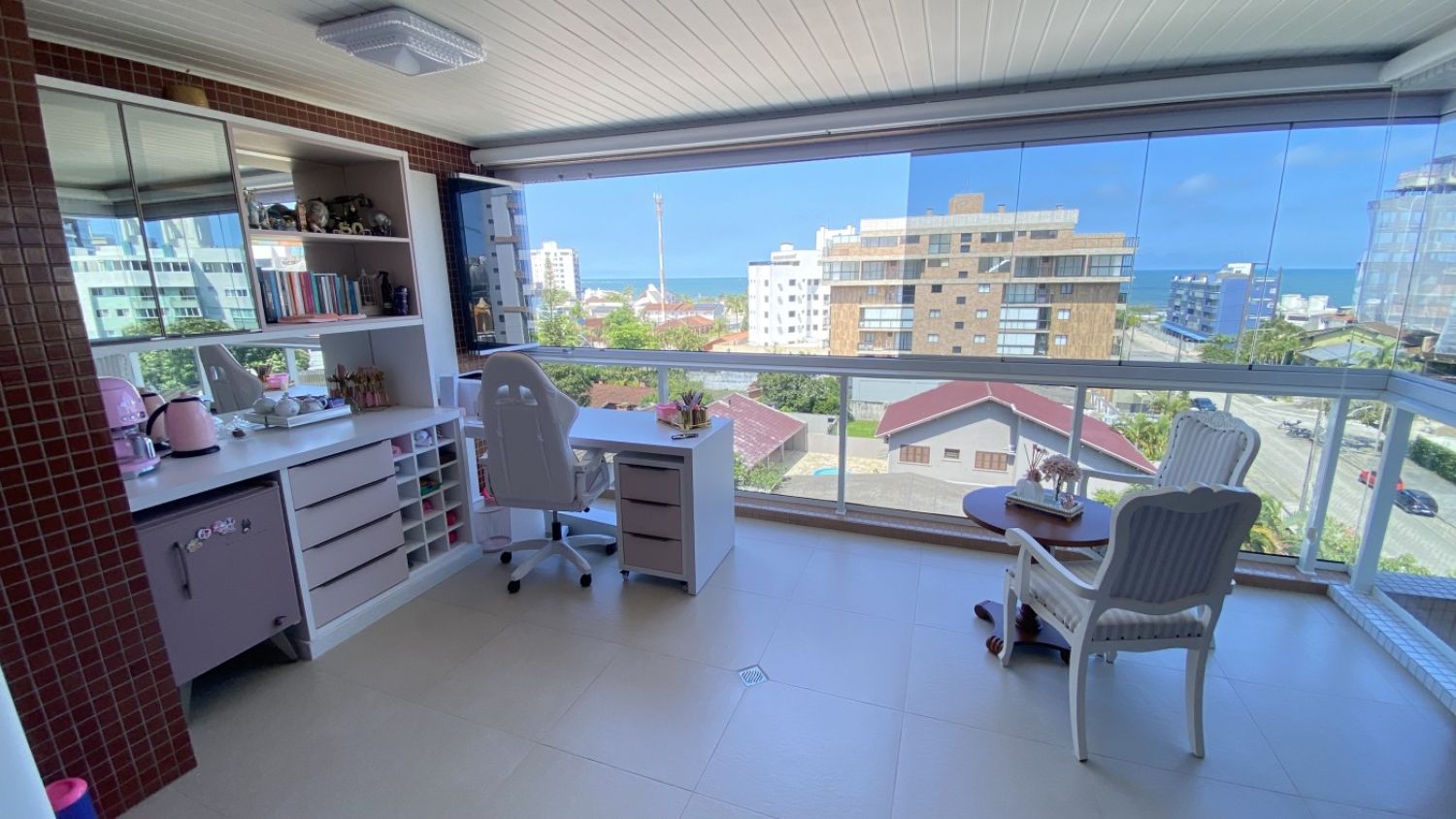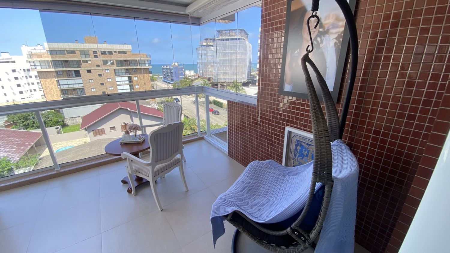 Sala íntima integrada à varanda, com uma vista panorâmica incrível